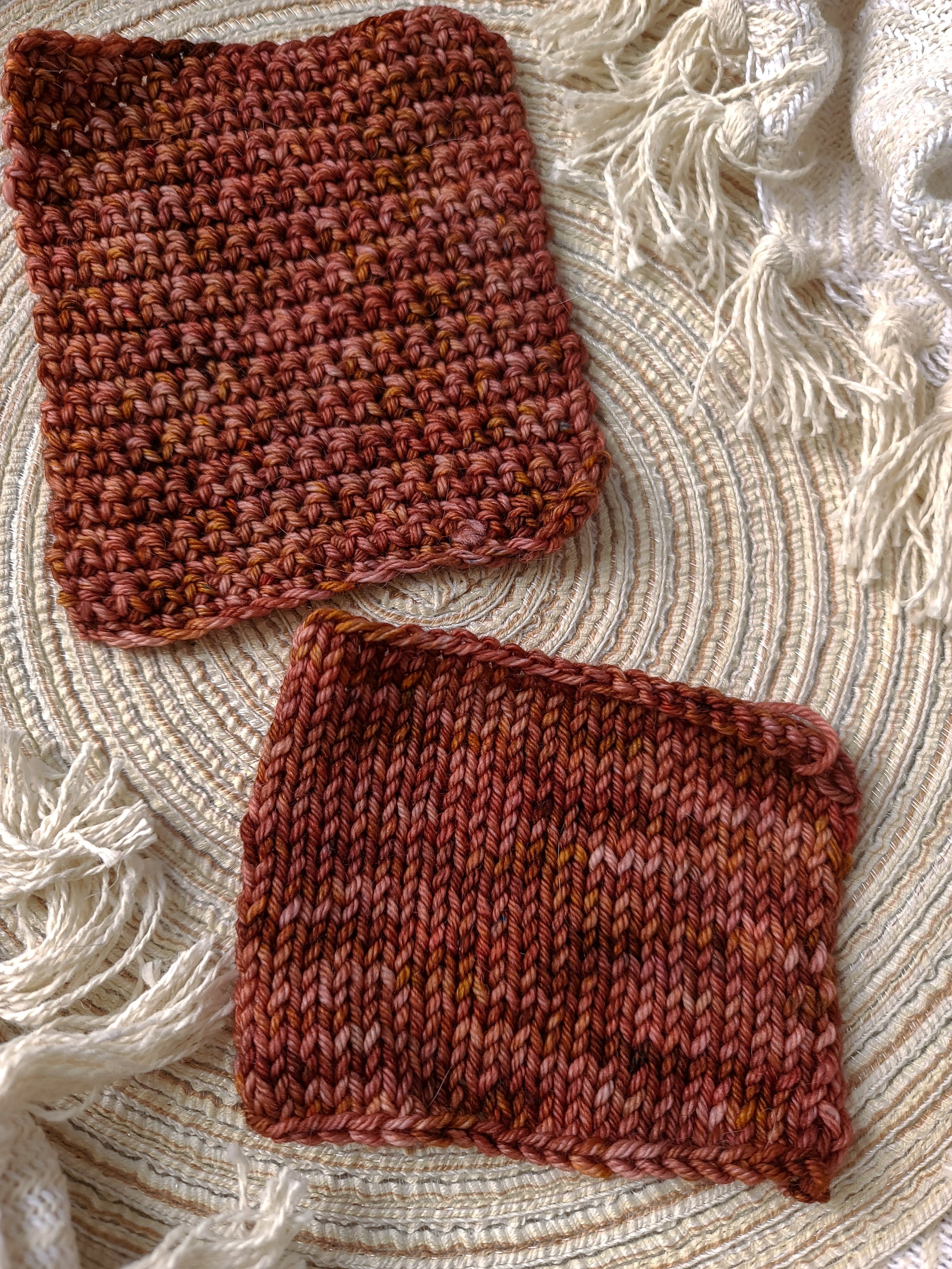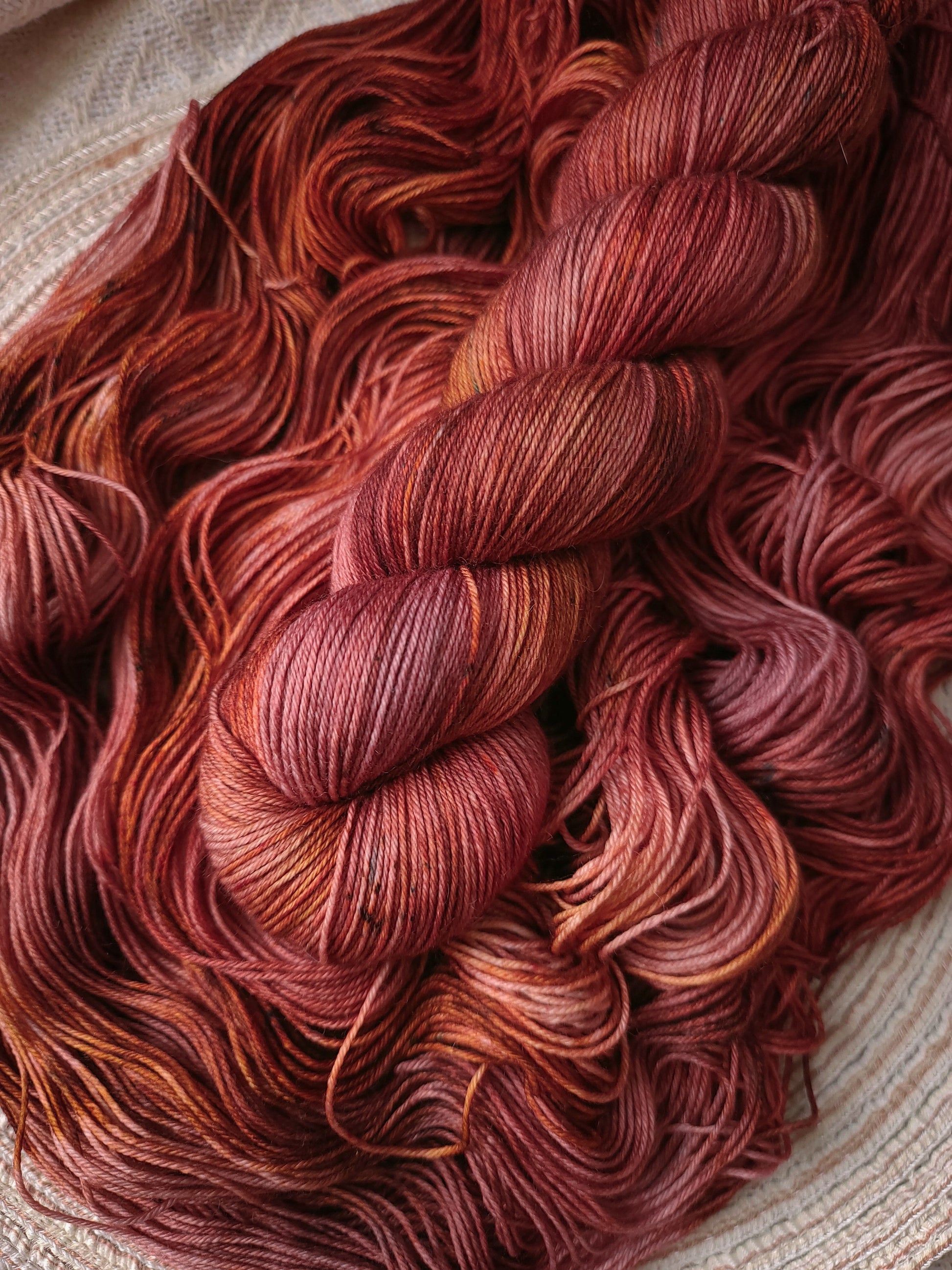 This colourway looks positively delicious - like that perfect picnic meat snack. Shades of cinnamon, chili pepper, and mahogany covered in brown speckling.