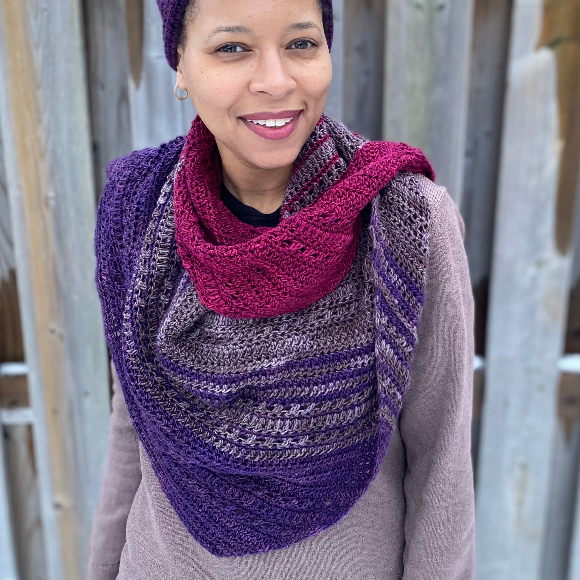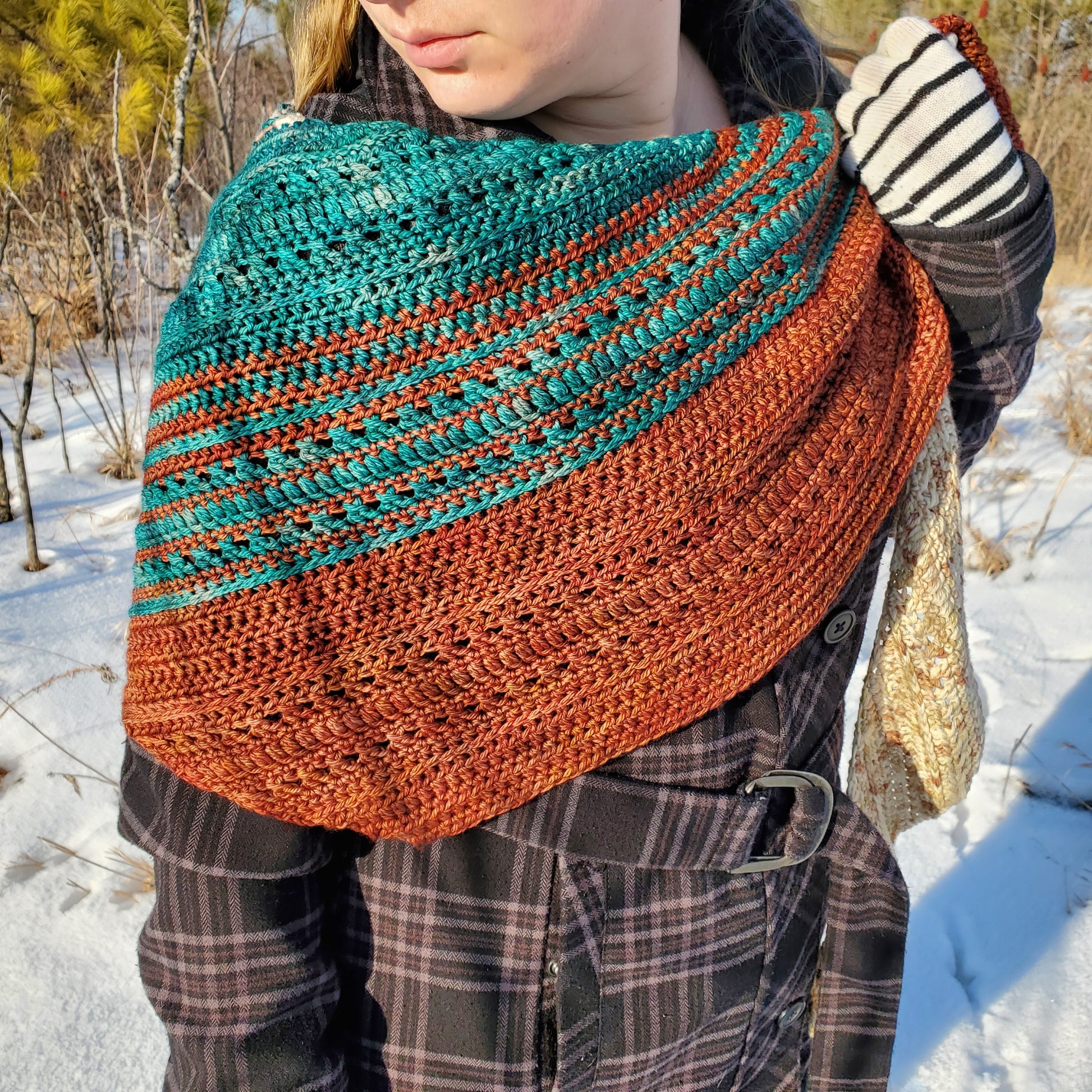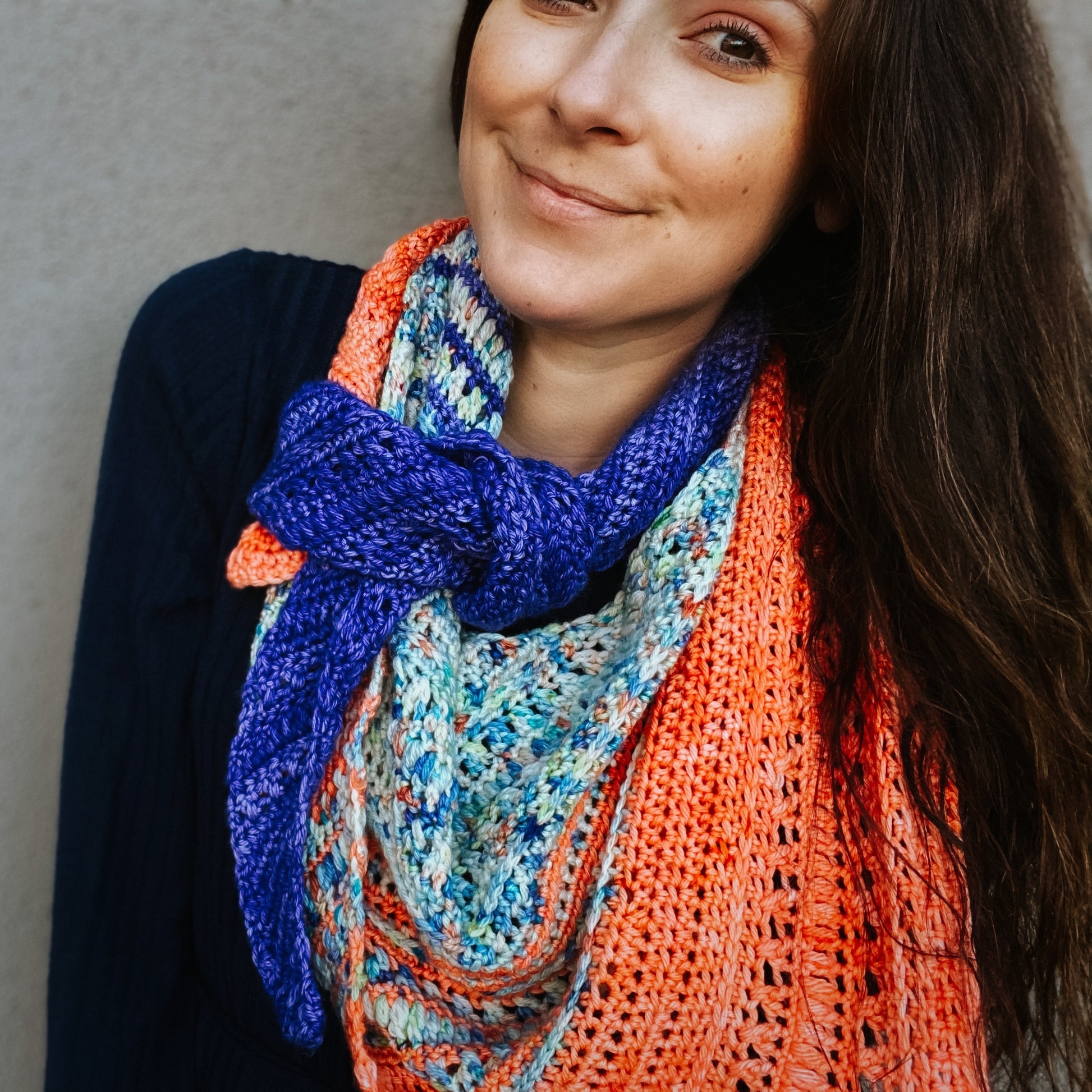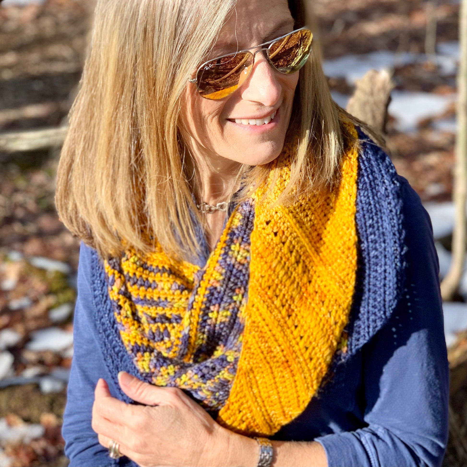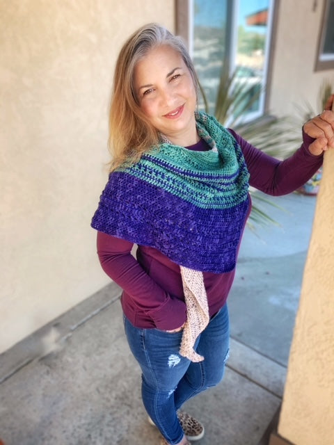 This shawl uses DK yarn (several testers used 3 skeins of hand-dyed), making it absolutely perfect FOR EVERY SEASON!! And it’s asymmetrical shape gives so many versatile styling options! And the texture - ohhhh, the texture. Raised stitching, bean stitches and crossed stitches give this shawl incredibly depth!