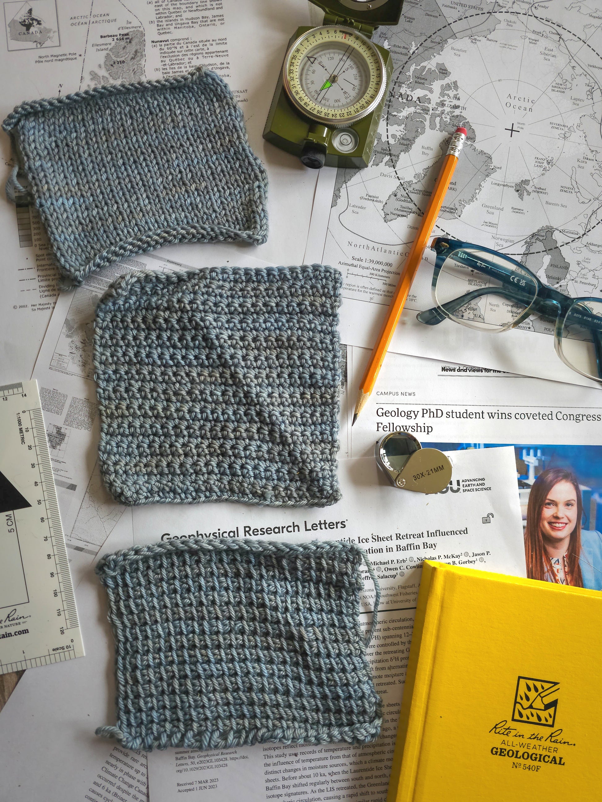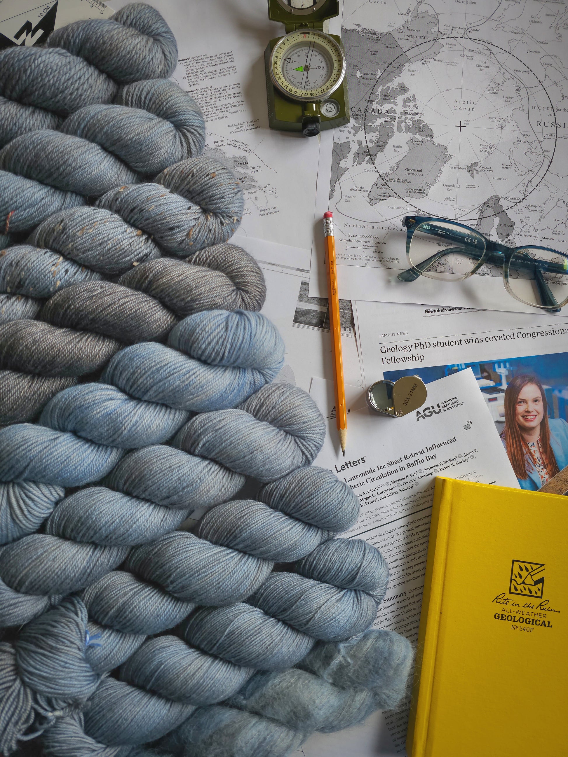 This collection was created in collaboration with the amazing Devon @stitches.and.science - it's her beautiful face you see in the flatlay! All of the inspiration photos are from her and her colleague, from their time in Greenland and on Baffin Island during their studies. She has a Ph.D. in geological studies and is currently working in climate policy.