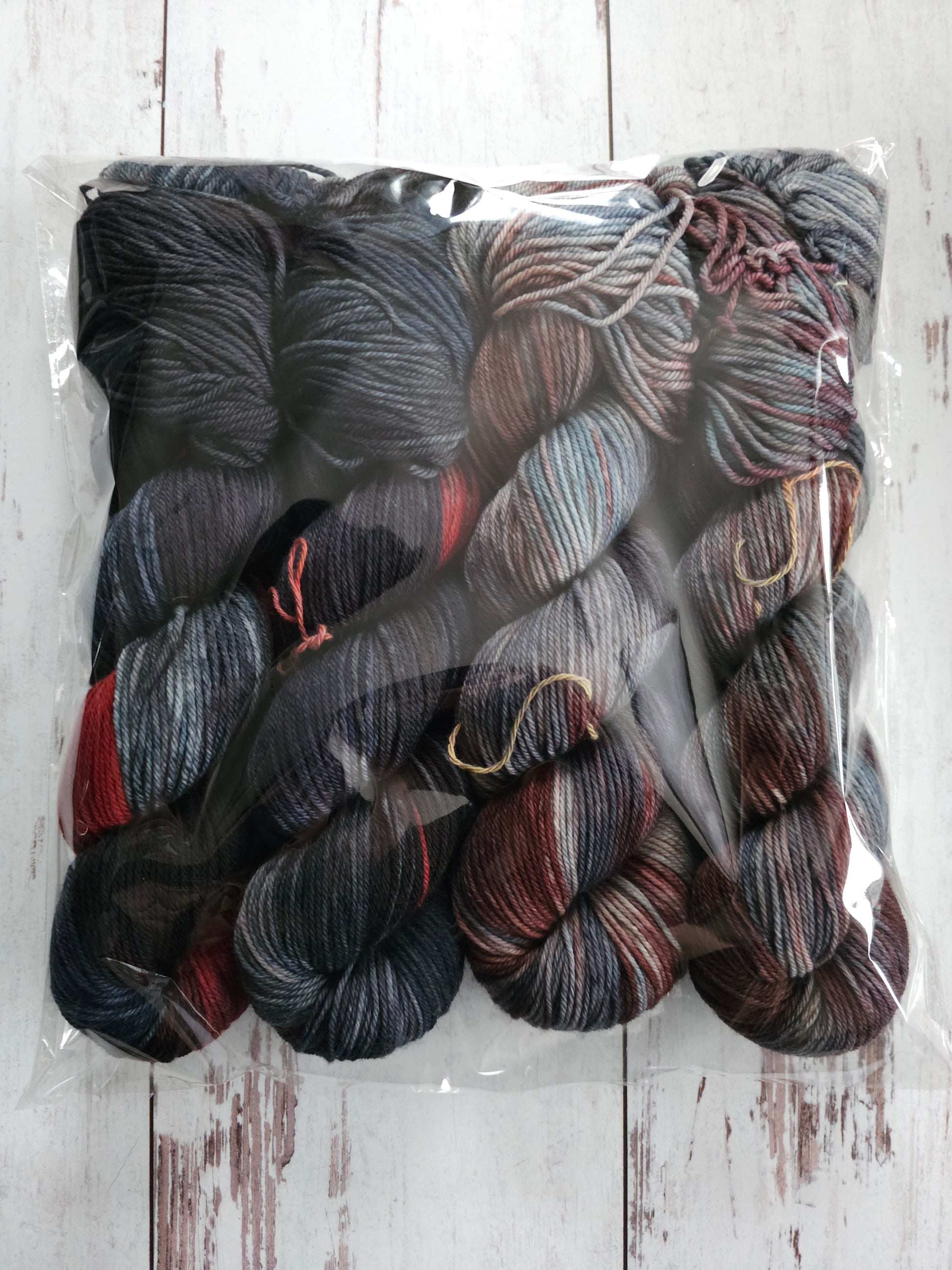 Four variegated skeins dyed on our Deep Freeze DK base - two grey/black/blue ombre skeins and two blue/grey/maroon skeins.