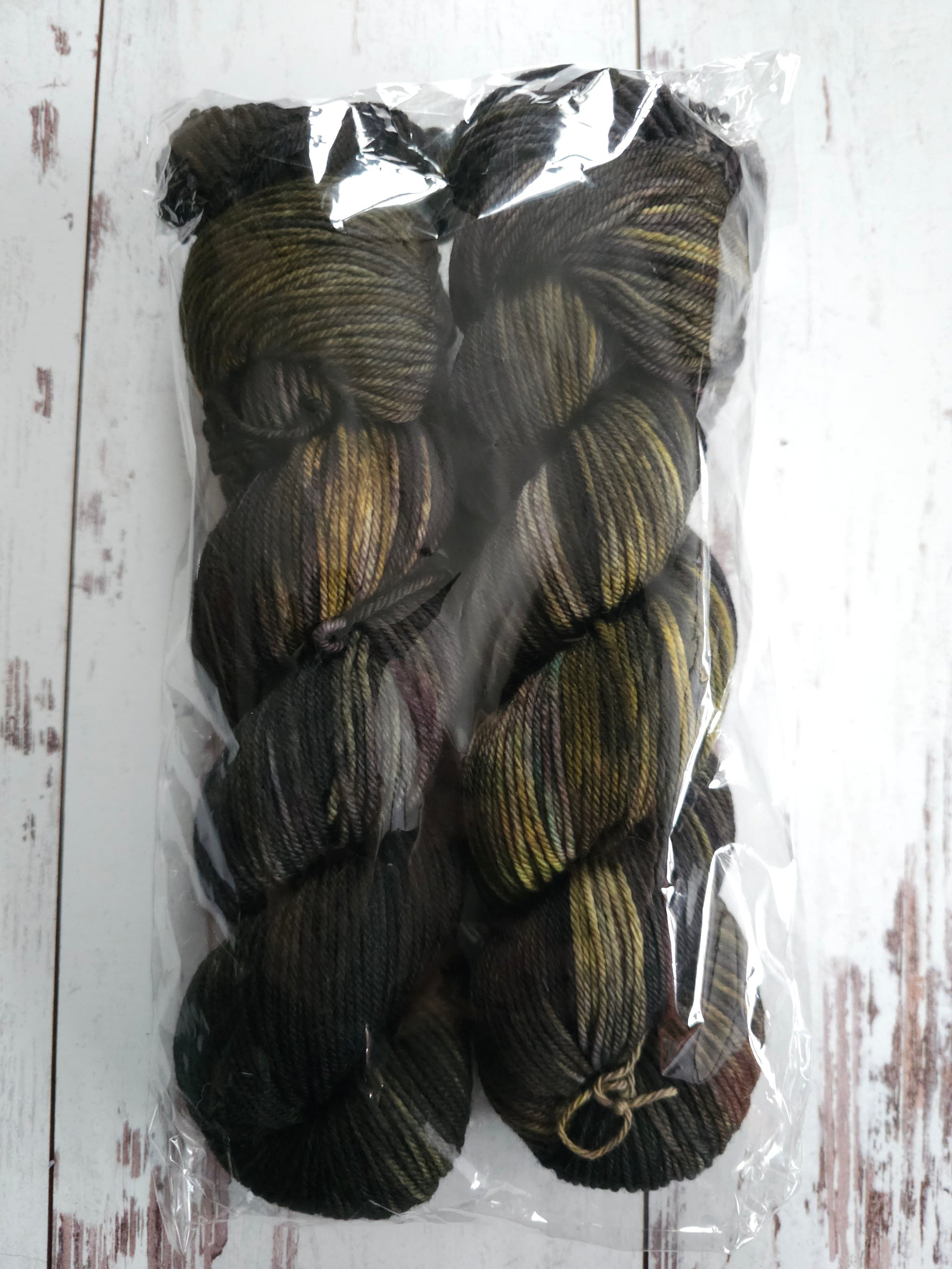 Two skeins of a swampy green/black variegate on Deep Freeze DK.