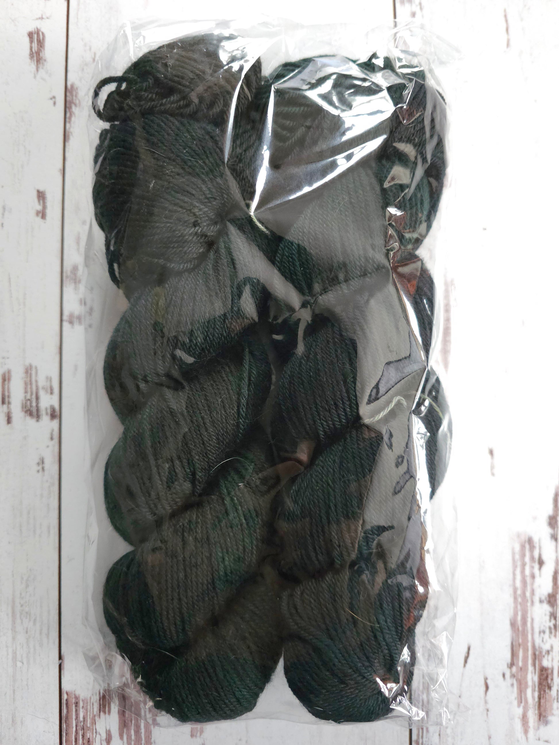 Two tonal skeins on Winter Worsted - one moody very dark green, and one black-leaning green.