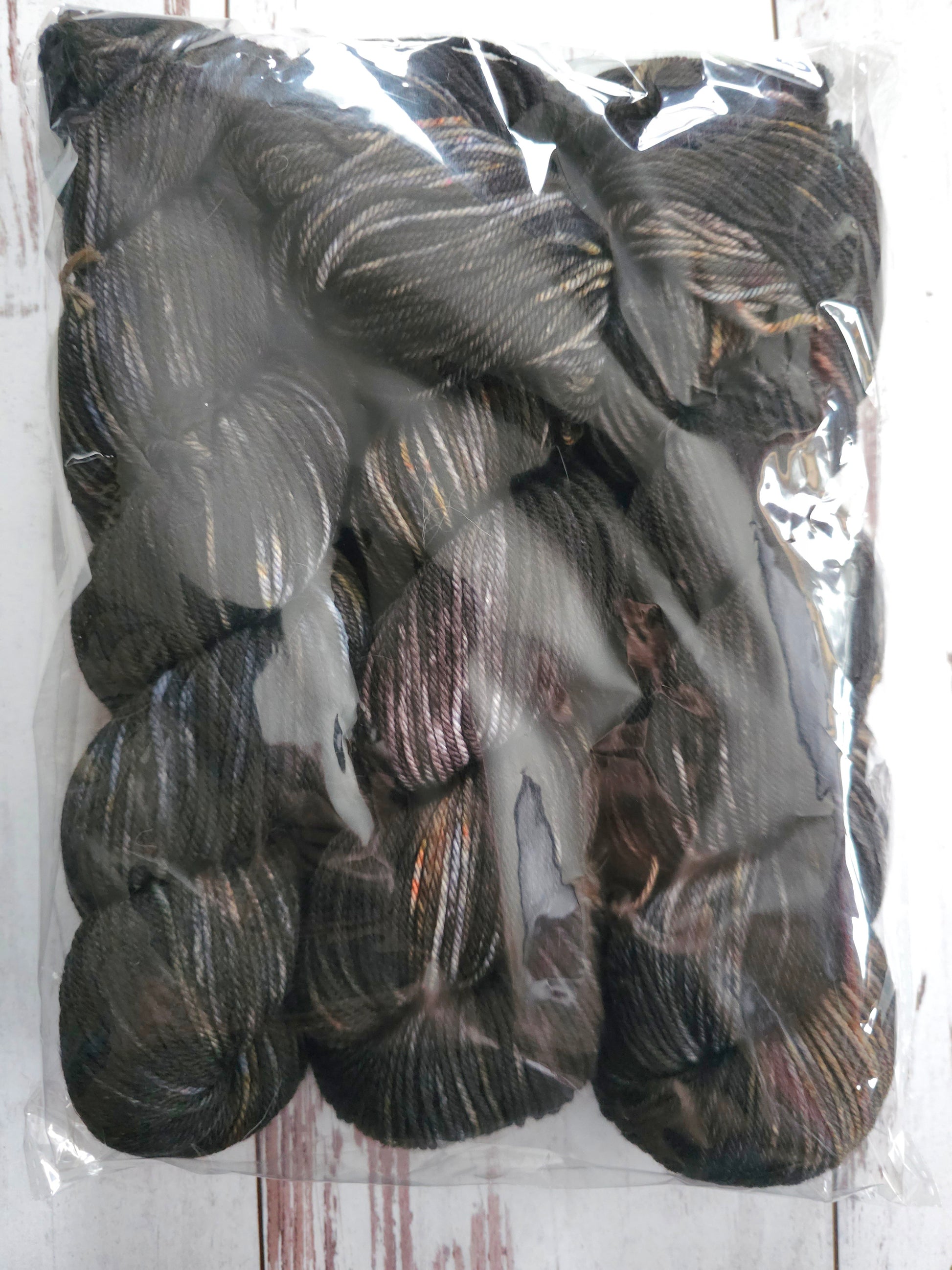 Three skeins of a black variegate with blue and golden speckling on Deep Freeze DK.