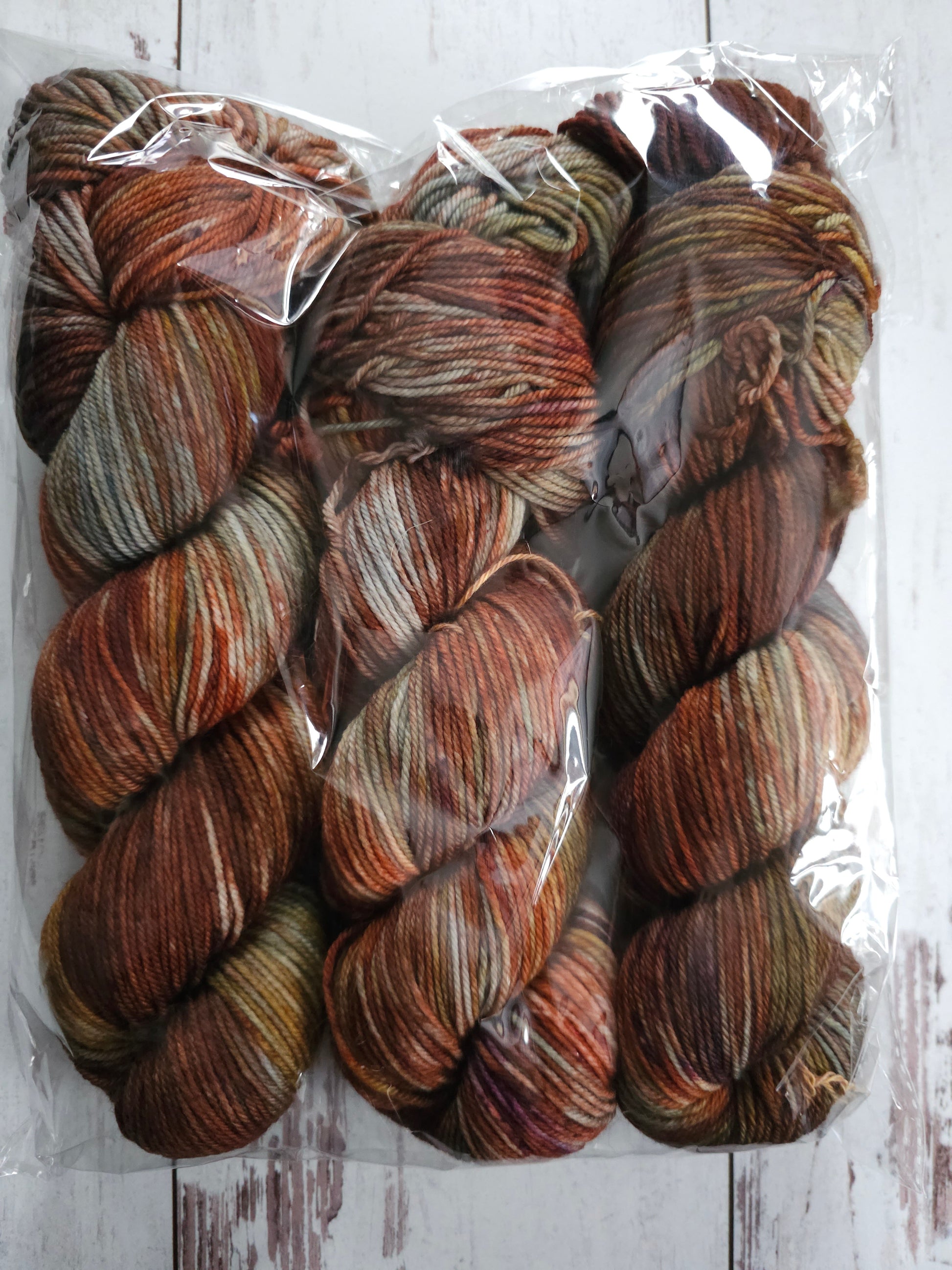 Three skeins of a warm orange/red/seafoam variegate on Deep Freeze DK. This was a test batch for Arabesque.