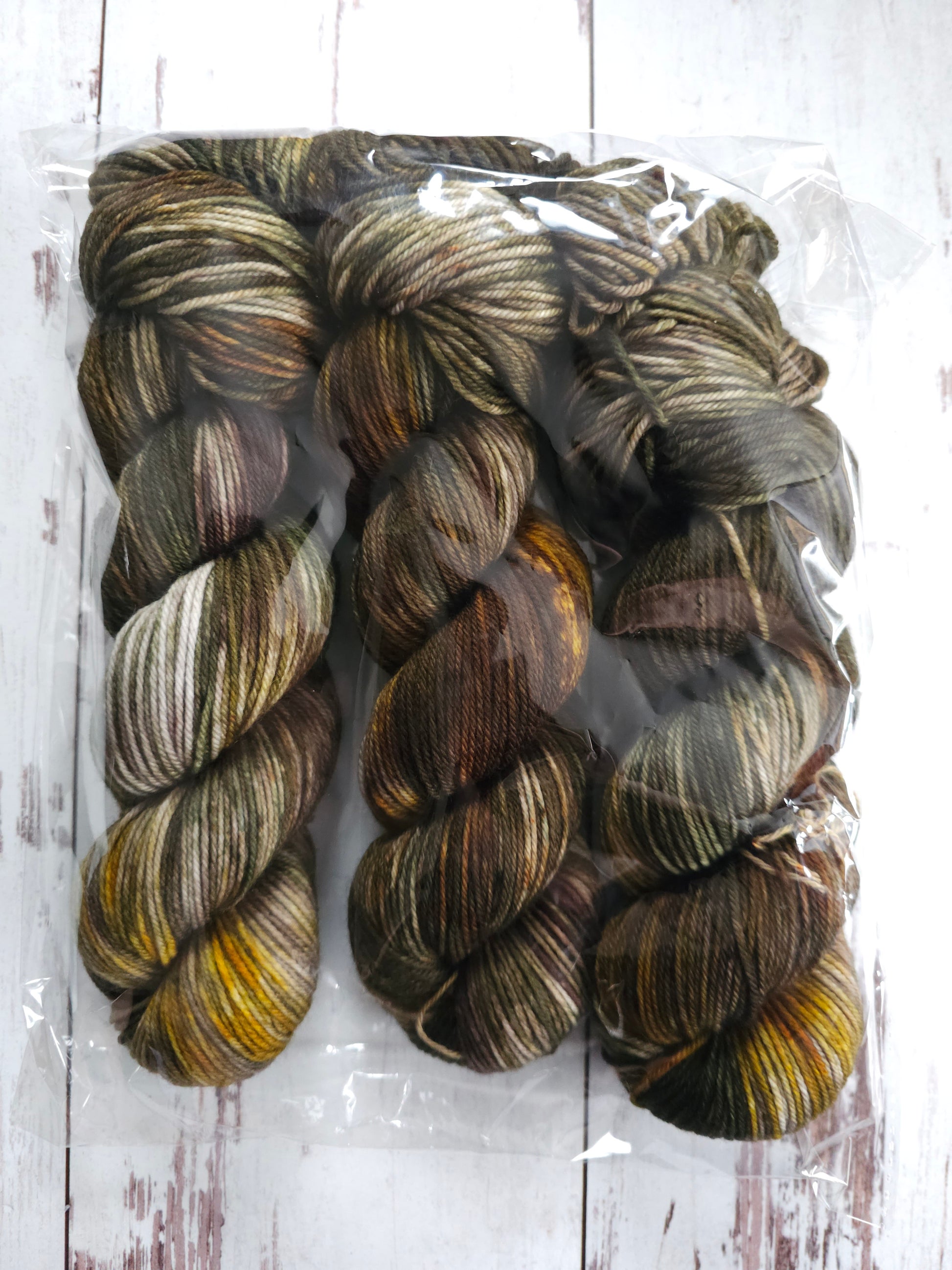 This is a test batch for "The Golden Idol" from our Indiana Jones Box. Three skeins of a green/brown/gold variegate on Deep Freeze DK.