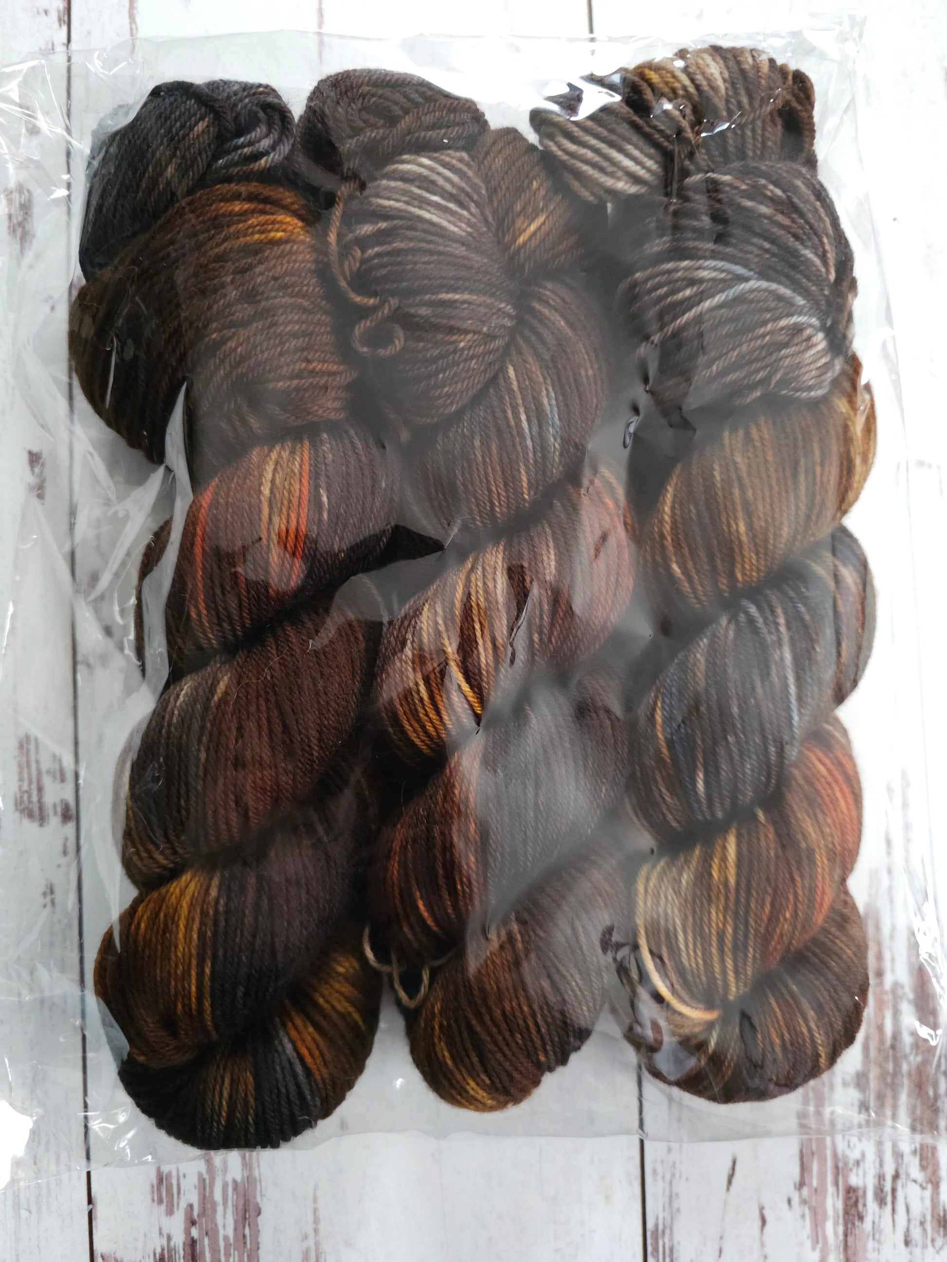 Three skeins of a brown/blue/yellow/orange variegate on Deep Freeze DK. This was a test batch from our Indiana Jones Winter Box.