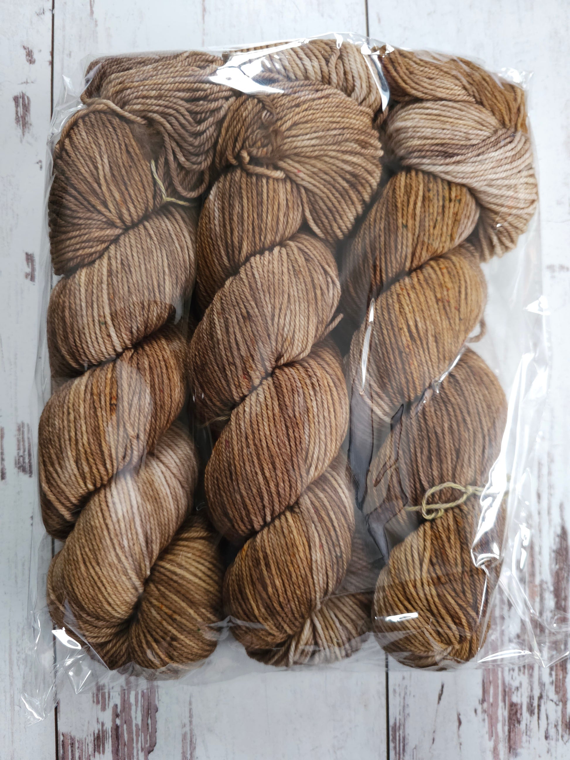 Three skeins of a low-contrast light brown variegate with toffee speckling on Deep Freeze DK.