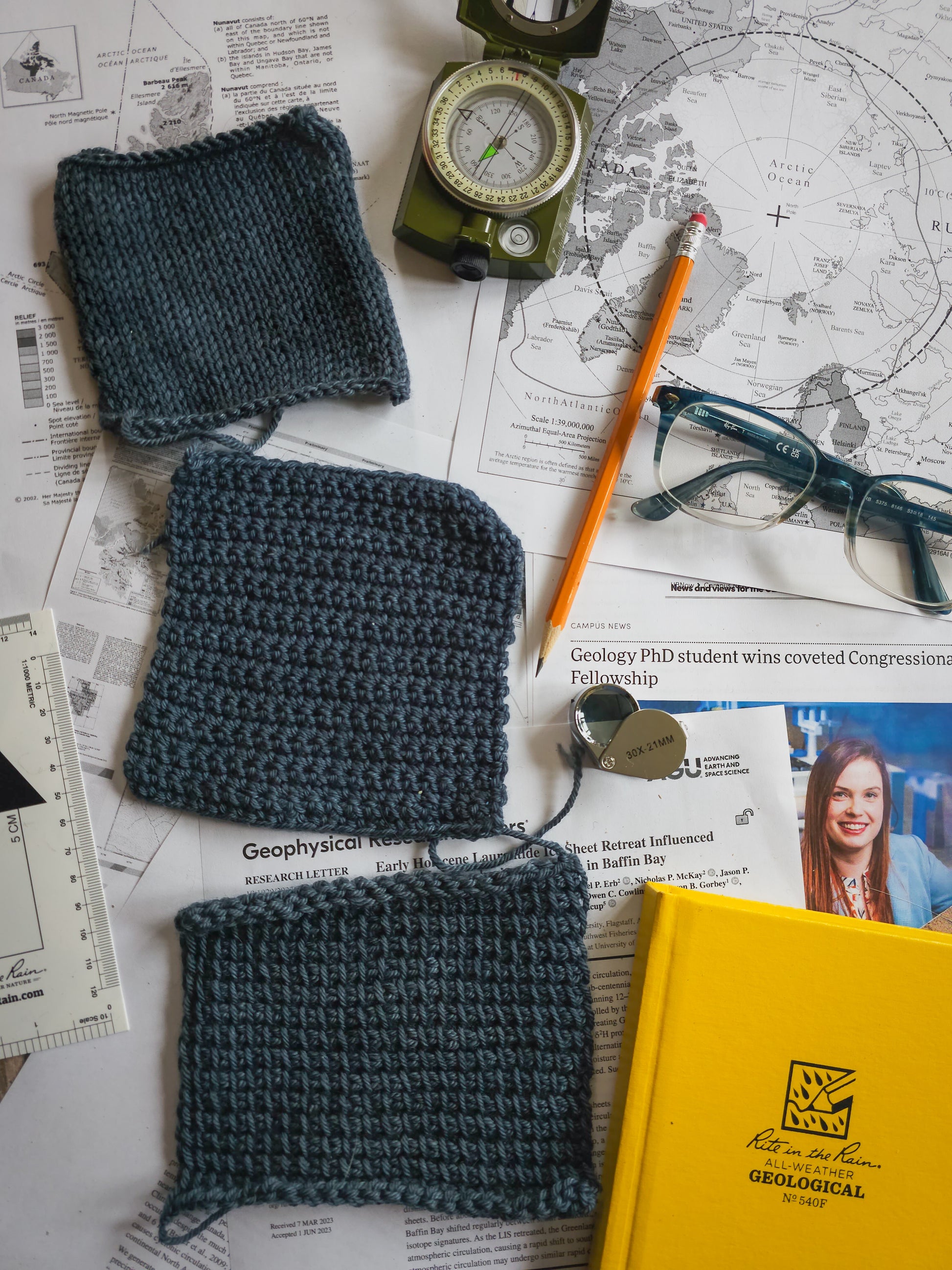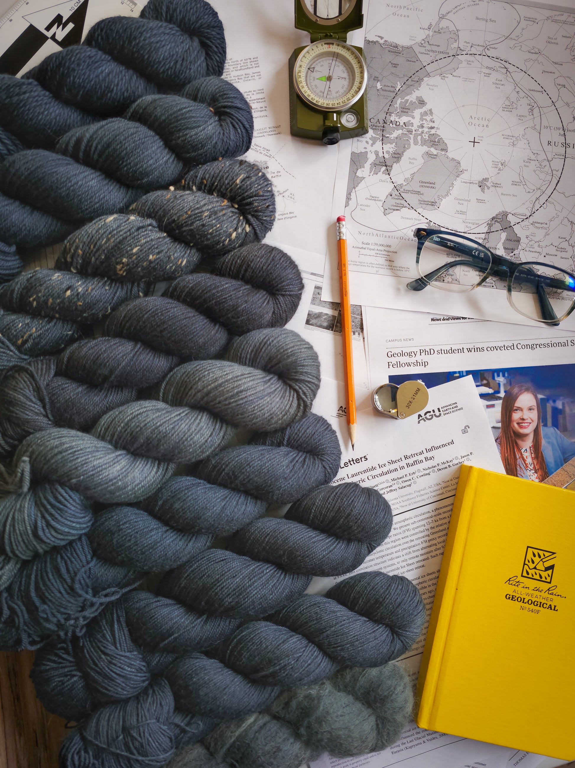 This collection was created in collaboration with the amazing Devon @stitches.and.science - it's her beautiful face you see in the flatlay! All of the inspiration photos are from her and her colleague, from their time in Greenland and on Baffin Island during their studies. She has a Ph.D. in geological studies and is currently working in climate policy.