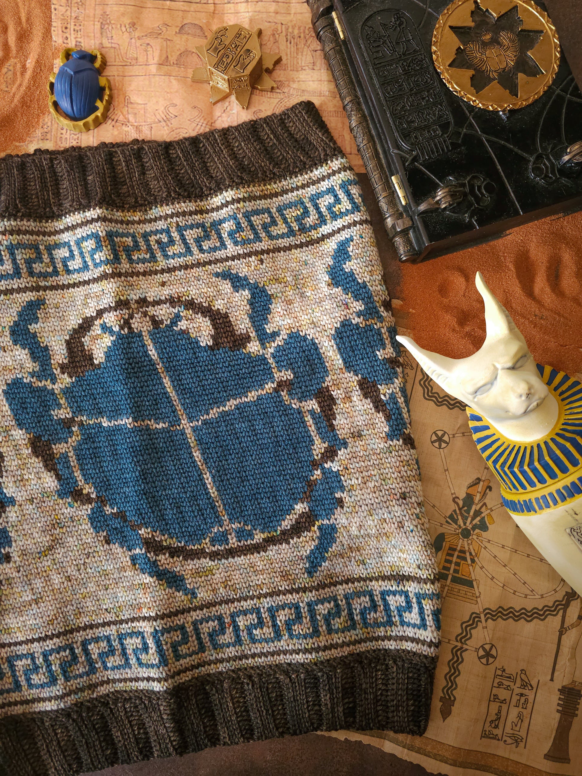 Enter “The Scarab Cowl”, a beautiful colourwork cowl inspired by the creepy crawlers themselves. You’ll create the image of a scarab and a simple Egyptian motif with CSC colourwork, and top it off with gorgeous slst ribbing.