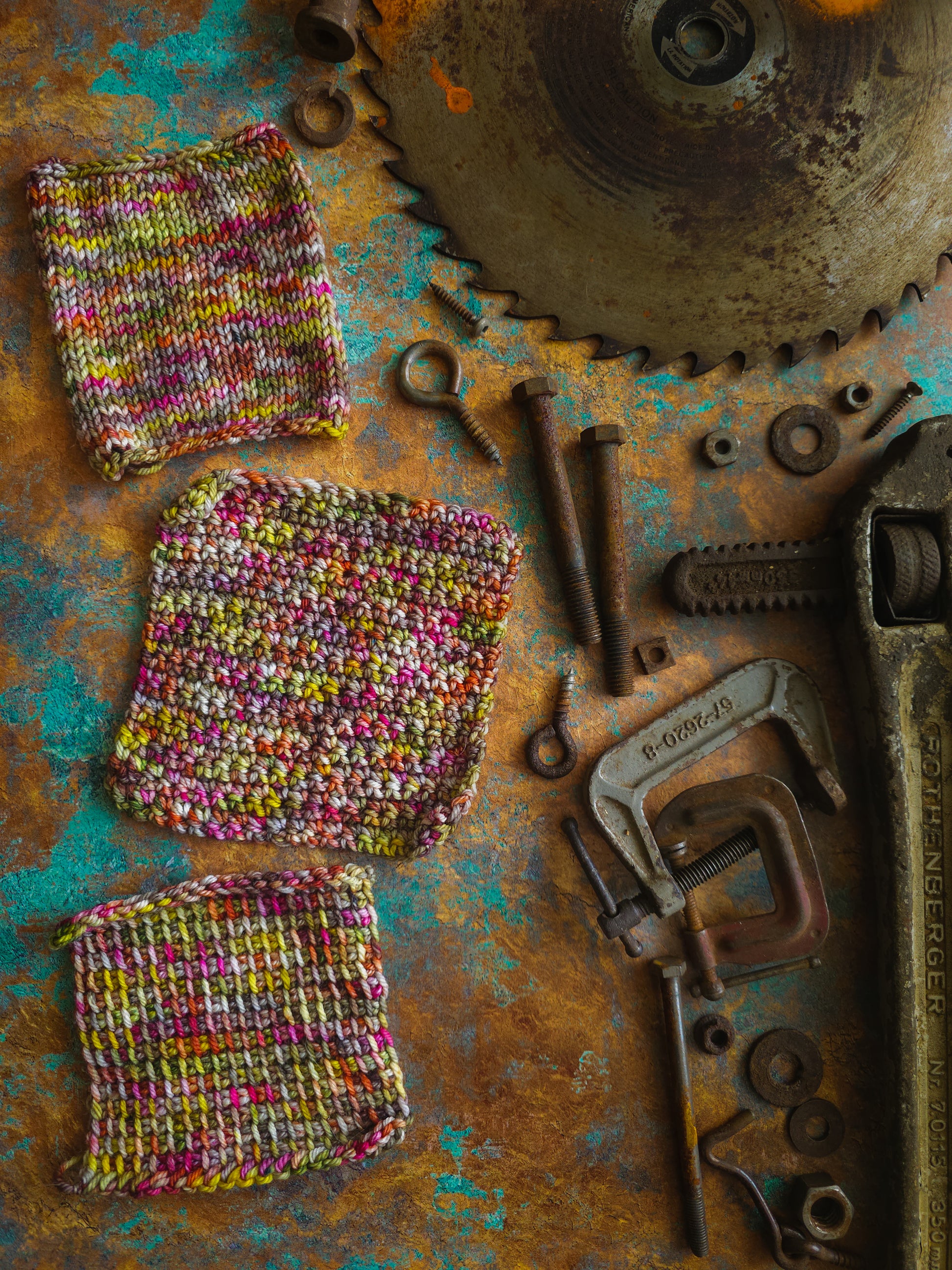 Weathered is a WILD - nearly ten different colours are used to create this eclectic beast of a variegate (and such a fun unexpected combo, I might add). It begins with a base of greys in varying warm and cool shades. Then it's topped with a sunny yellow, bold pink, grass green, rusty orange, and a warm brown-grey to tie it all together.